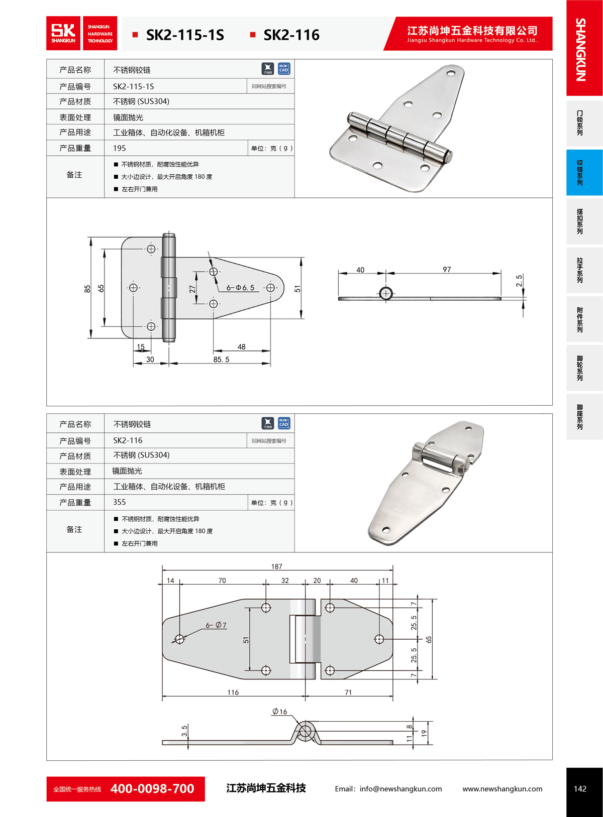 產(chǎn)品名稱:尚坤SK2-115-1S工業(yè)不銹鋼T型鉸鏈180度平開重型折疊合頁