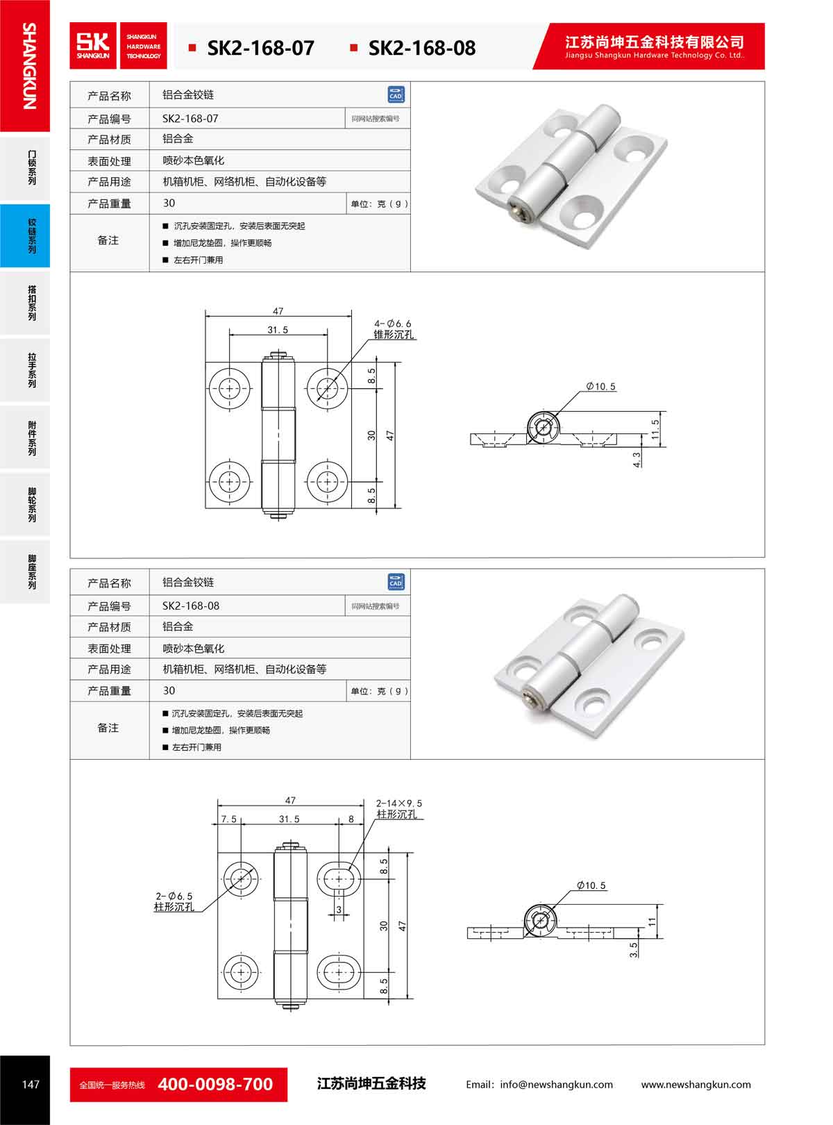 產品名稱:尚坤SK2-168-07工業五金鋁合金鉸鏈180度平開加厚折疊合頁