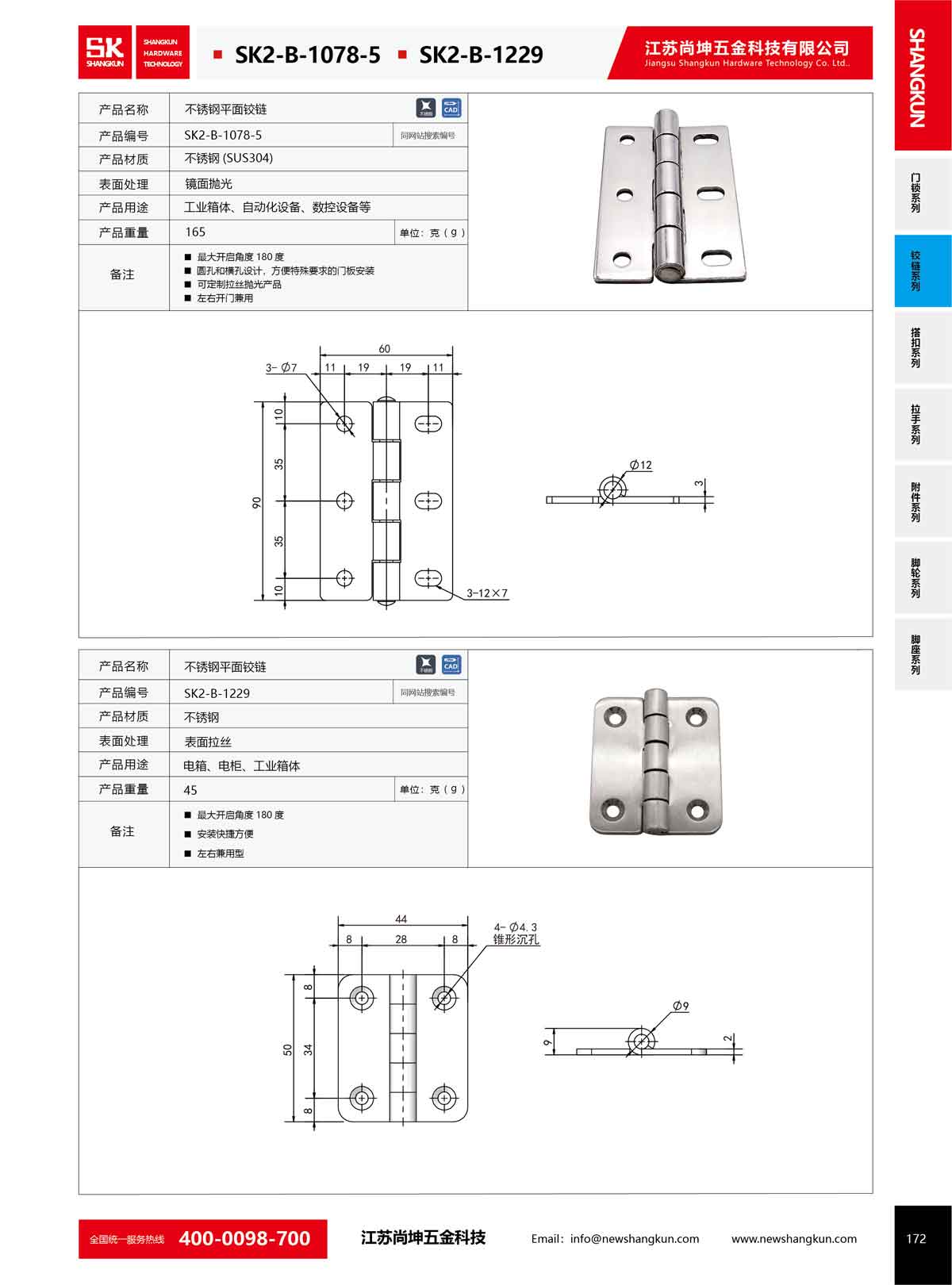 產品名稱:尚坤SK2-B-1078-5工業五金不銹鋼鉸鏈柜門180度平開重型加厚折疊合頁