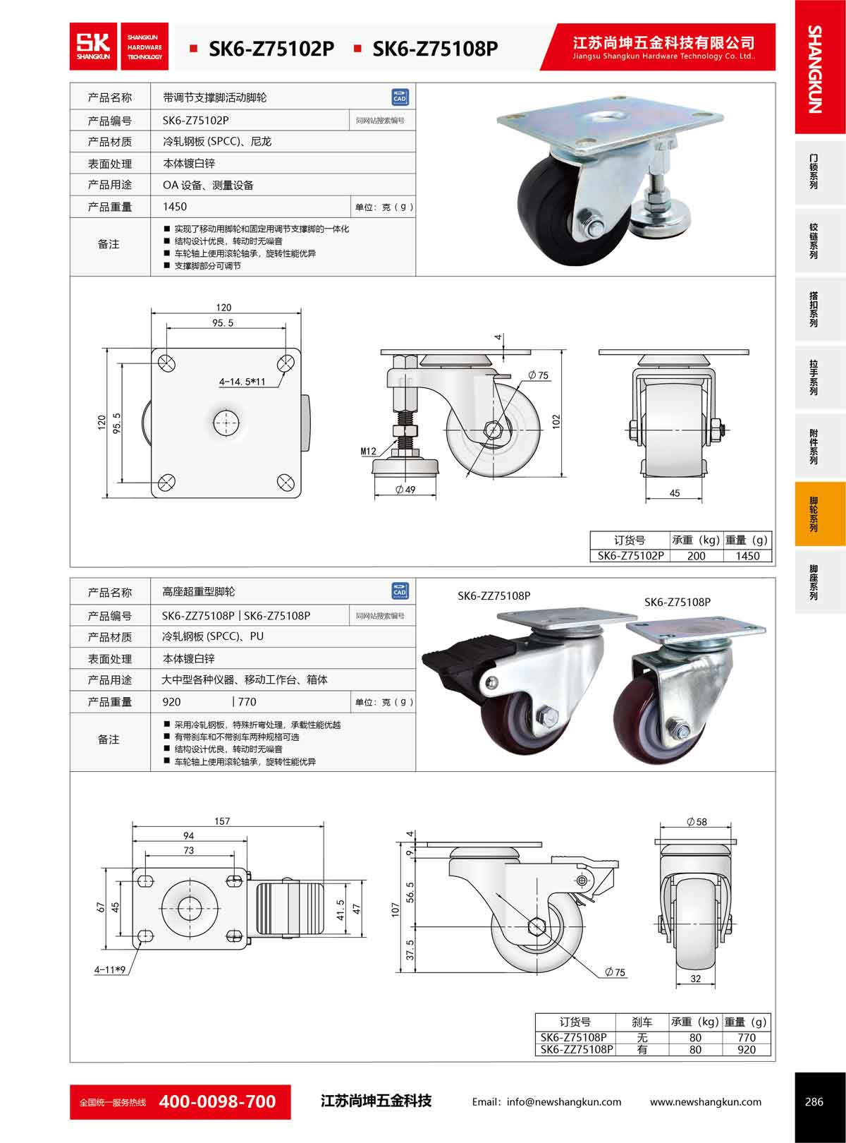 產品名稱:尚坤SK6-Z75108P工業高座重型支撐轉向活動腳輪帶剎車平板推車萬向輪子3寸